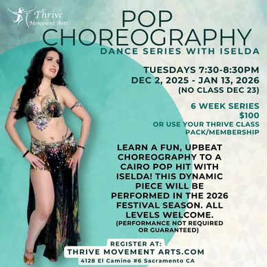 Learn a fun, upbeat Choreography to a Cairo Pop hit with Iselda! This dynamic piece will be performed for the 2026 festival season with student troupe Kanz Altaaj. Performing not required or guaranteed. Get a workout and learn the hottest new moves! All levels welcome.